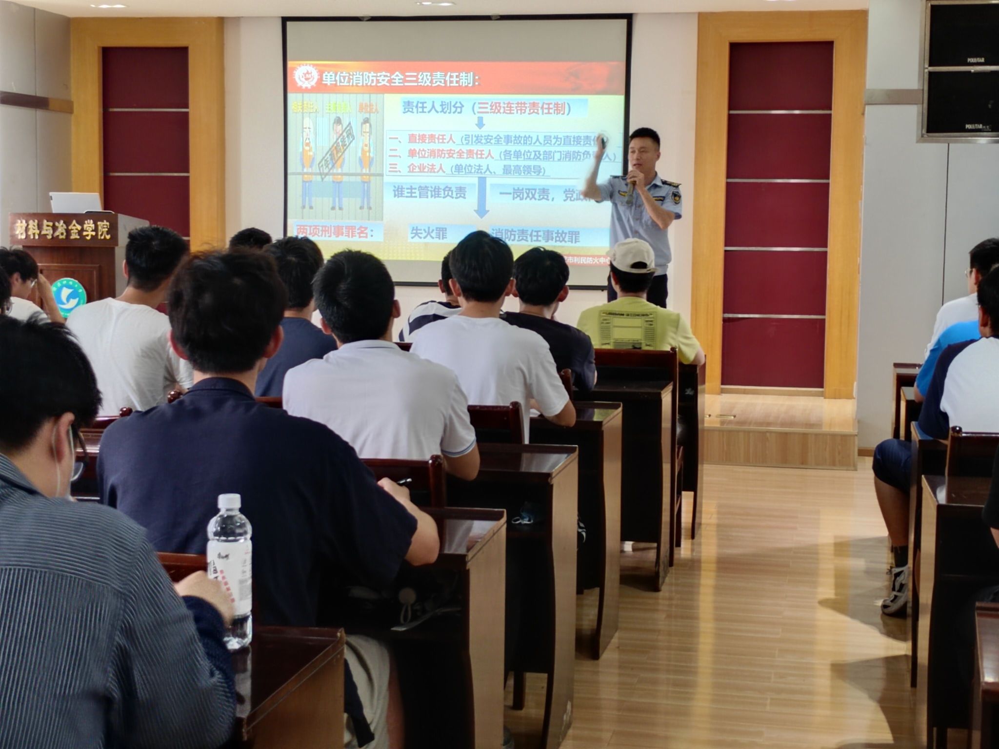 在消防安全讲座中,利民消防程教官首先展示了最近发生的几起特大火灾事故,深入浅出地分析了火灾的发生原因,指出大部分火灾的起因是人们的防范意识不足与操作不规范所导致;然后,讲授了发生火灾时常用的自救和逃生方式,强调不可冲动、盲目逃生。通过程教官的展示与讲解,师生对于防火防灾有了更全面的认识,防范火灾意识和应急逃生自救的能力进一步增强。