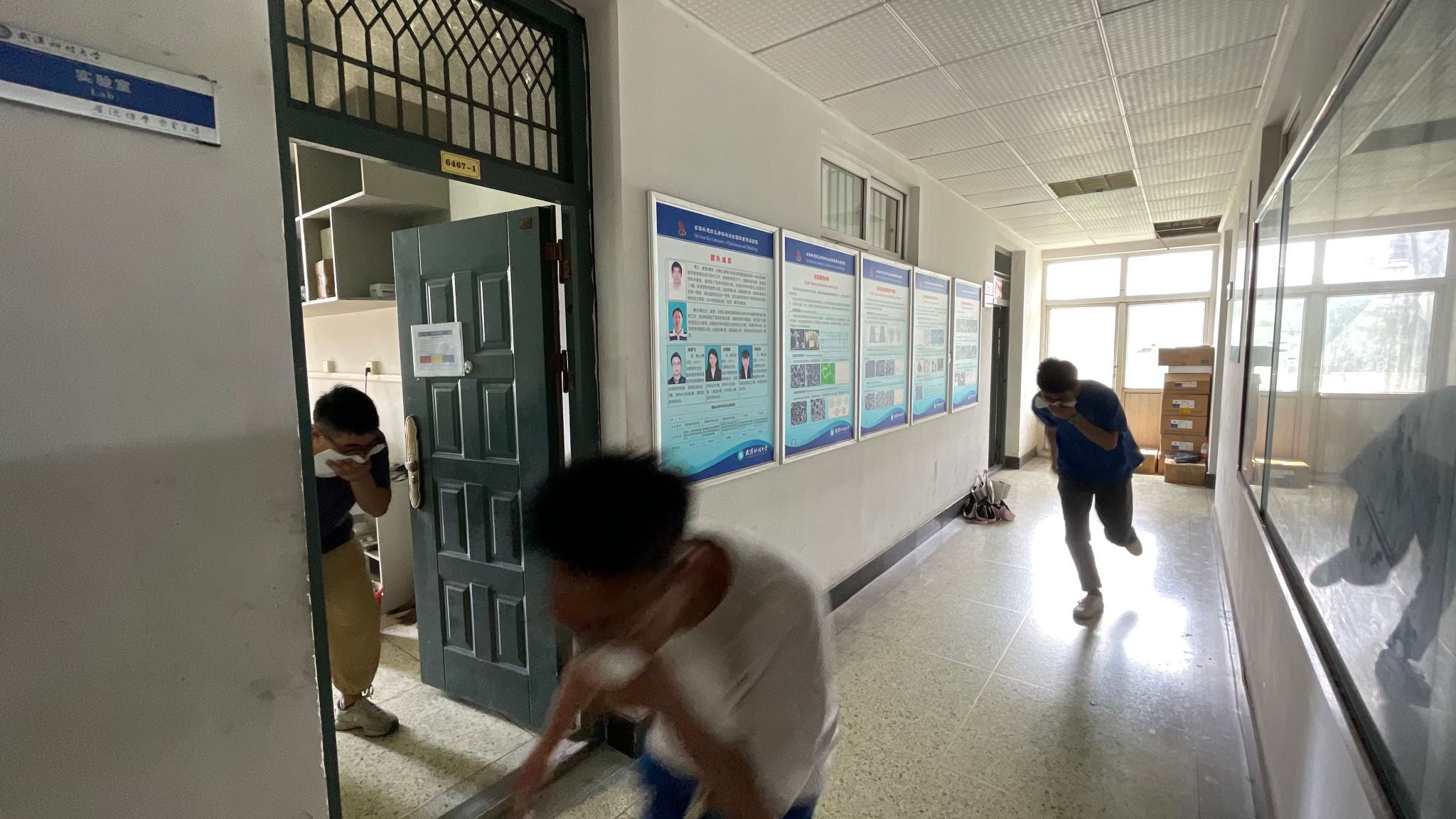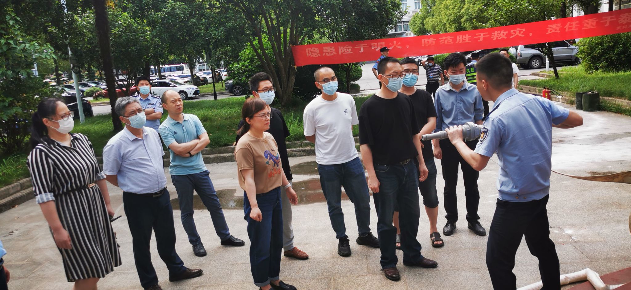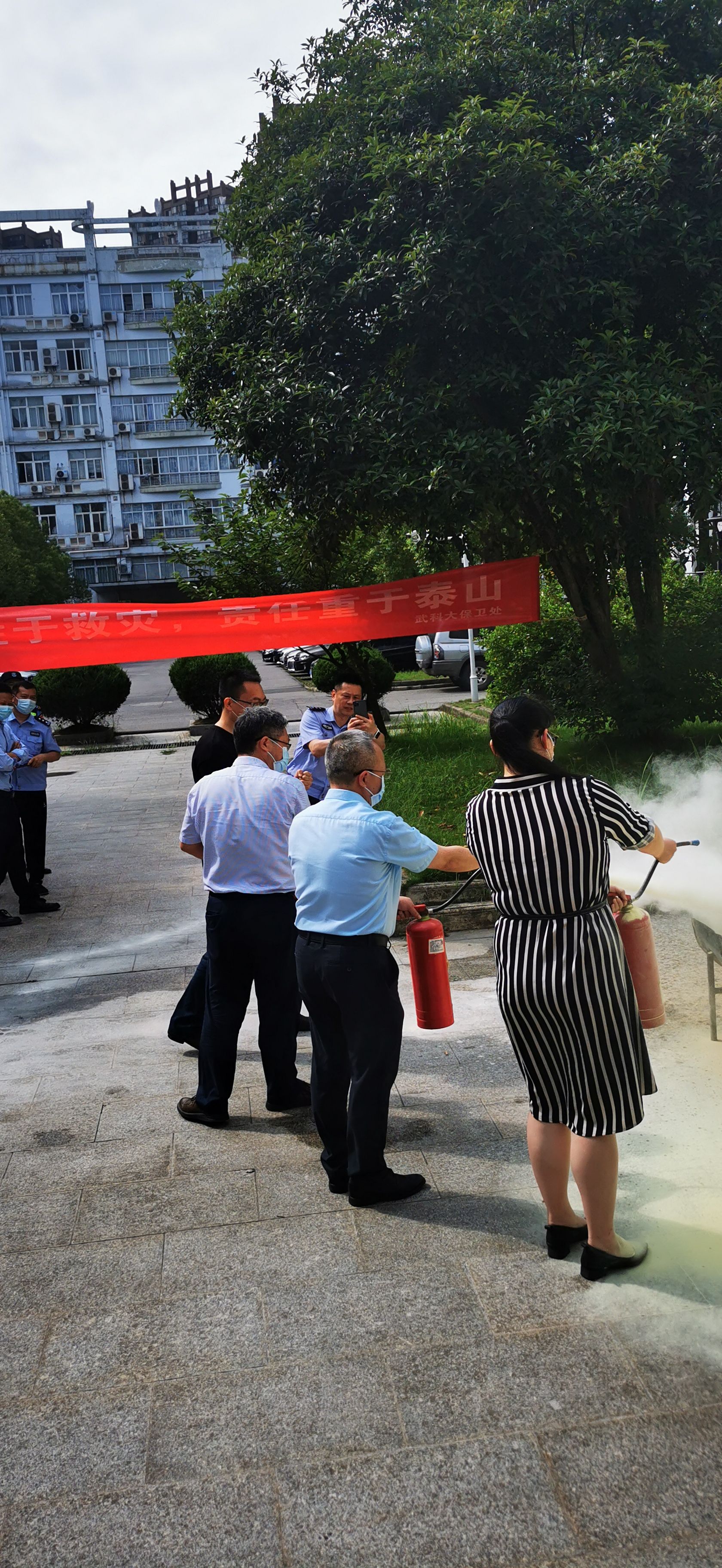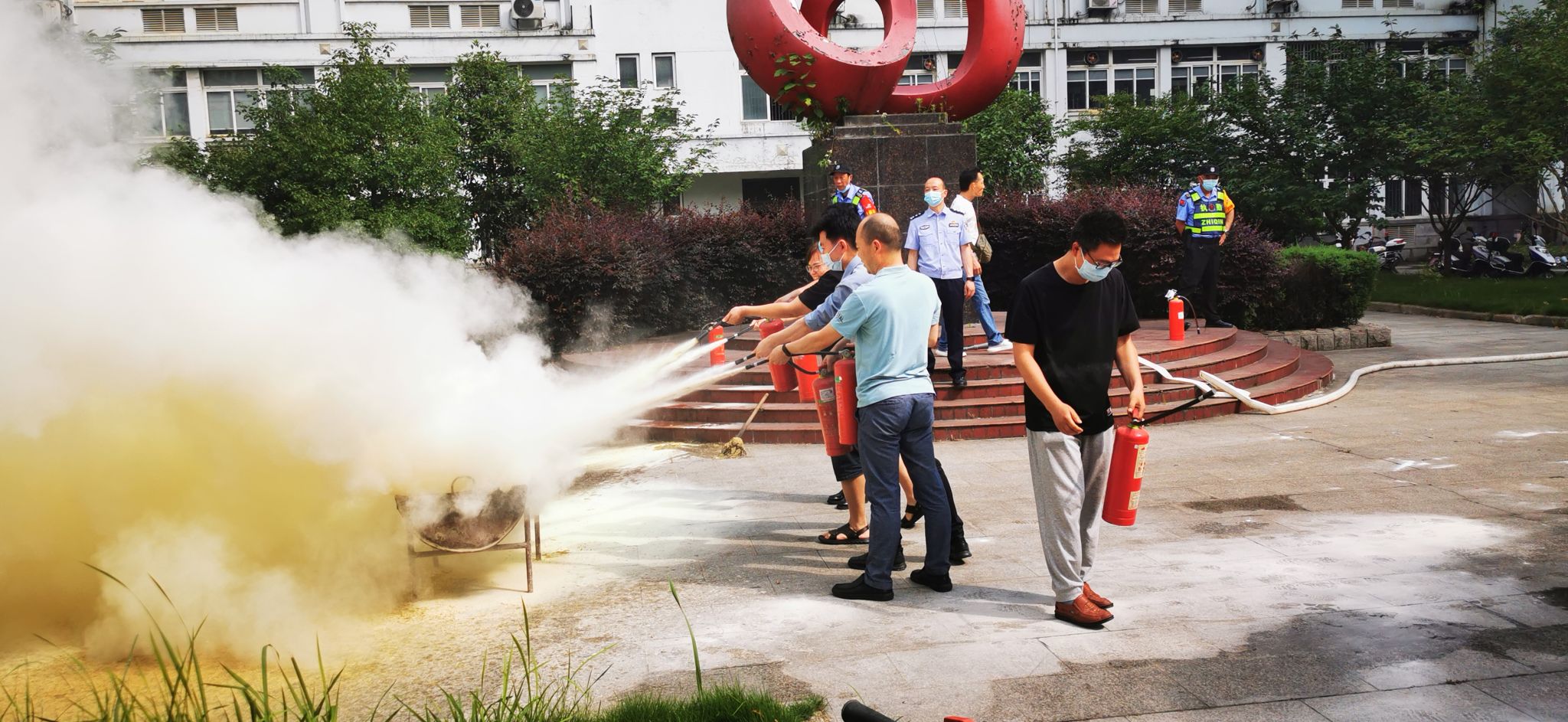 在消防实操演练中,教六楼鸣响火灾警报、各楼层被“烟雾”笼罩。师生在听到警报并发现烟雾后在负责人的指挥和引领下有序疏散至广场。在广场上,程教官展示了灭火器与消防栓的正确用法,并在现场燃起明火让师生们进行灭火演练。