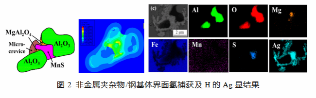 针对钢中最小原子H的原位、直观、快速表征难题,团队发明了原位氢显、微区氢渗透、氢分布/逸出快速表征检测技术,实现了钢中复合夹杂物界面氢扩散/捕获、单颗夹杂饱和氢捕获量、夹杂物界面氢逸出原位、实时、快速检测。率先揭示了钢中氢陷阱效应的微区界面应力机制,并据此创新性设计了微纳“Mg/Al/Ti等氧化物硬核-Mn/Ca等硫化物软壳”构型夹杂物,开发了改进的第三代氧化物冶金微Mg处理技术进行上述夹杂物精准控制,实现我国70级高强度海底厚板管线钢从0到1的突破。研究成果发表在材料腐蚀领域顶刊Corrosion Science, 195(2022)110006. (IF: 8.3) 。william威廉英国黄峰教授为论文通讯作者,博士生肖虎为第一作者。