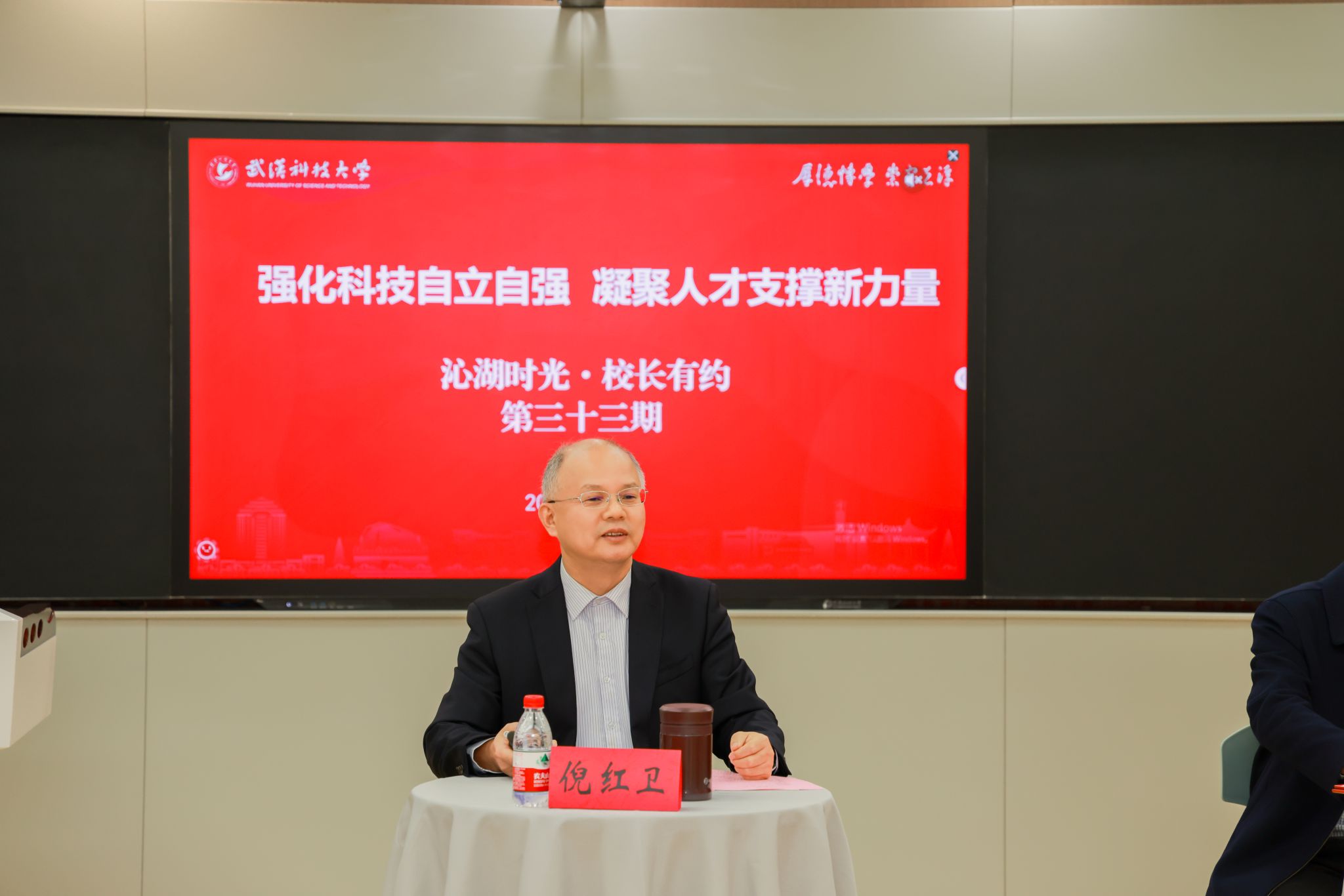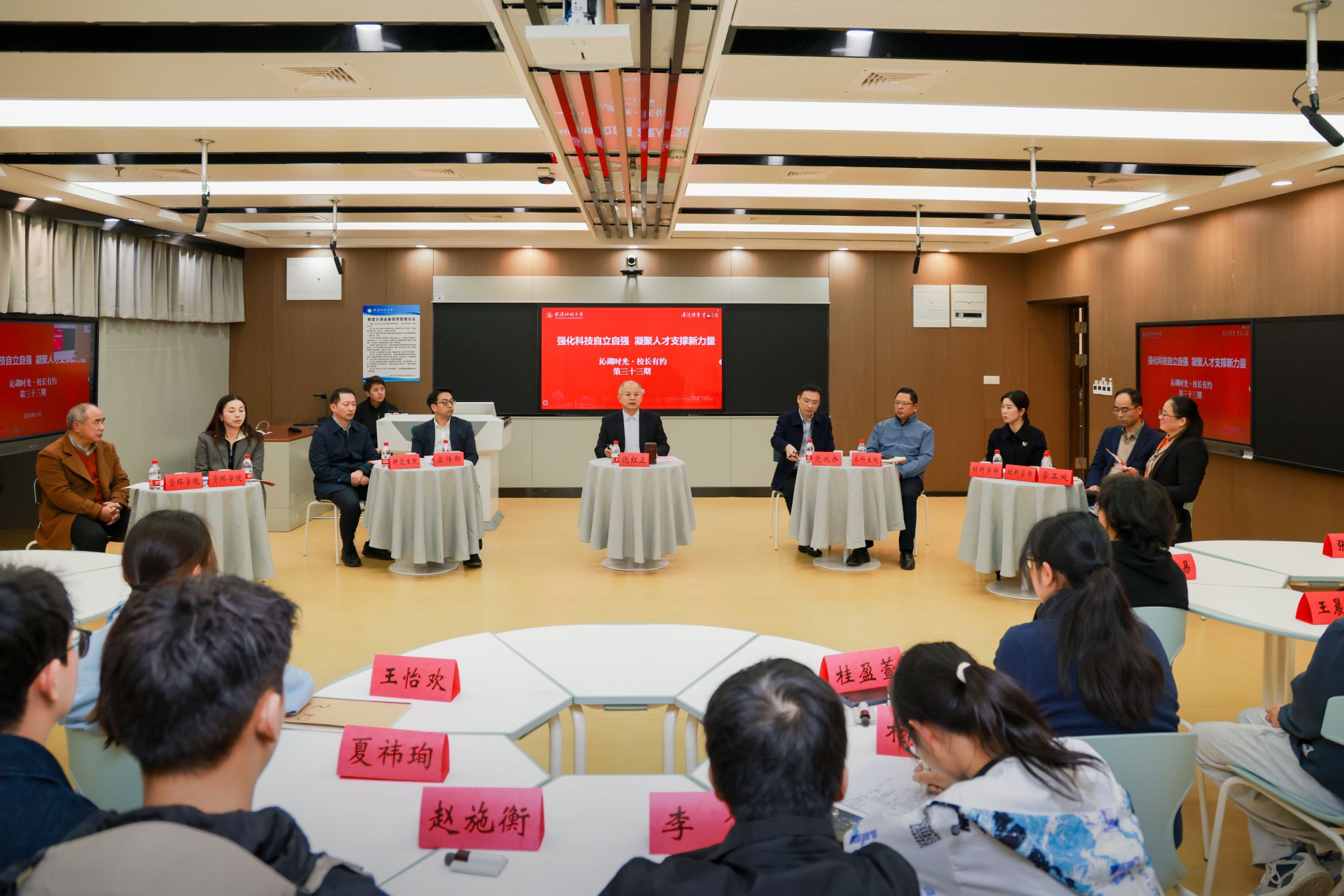 武科大网讯(通讯员牛诗涵 梁佩琦)11月21日,第三十三期“沁湖时光 校长有约”活动在黄家湖校区教十一楼举行。活动以“强化科技自立自强,凝聚人才支撑新力量”为主题,校长倪红卫与william威廉英国、资源与环境工程学院双学士学位专业学生代表共聚一堂,探讨跨学科融合创新,共话学生成长与发展。党委学生工作部(处)部(处)长潘丽莎主持会议。