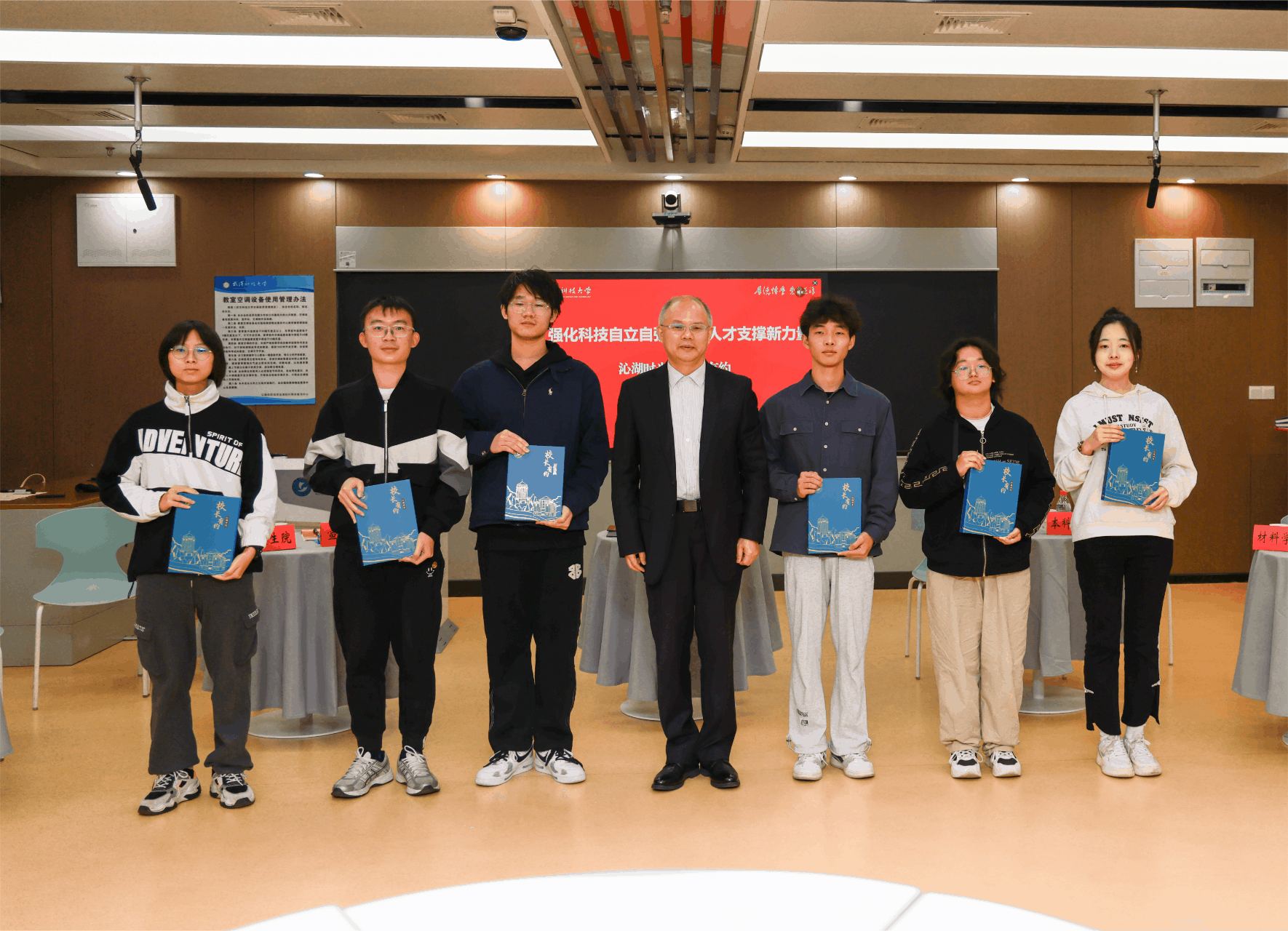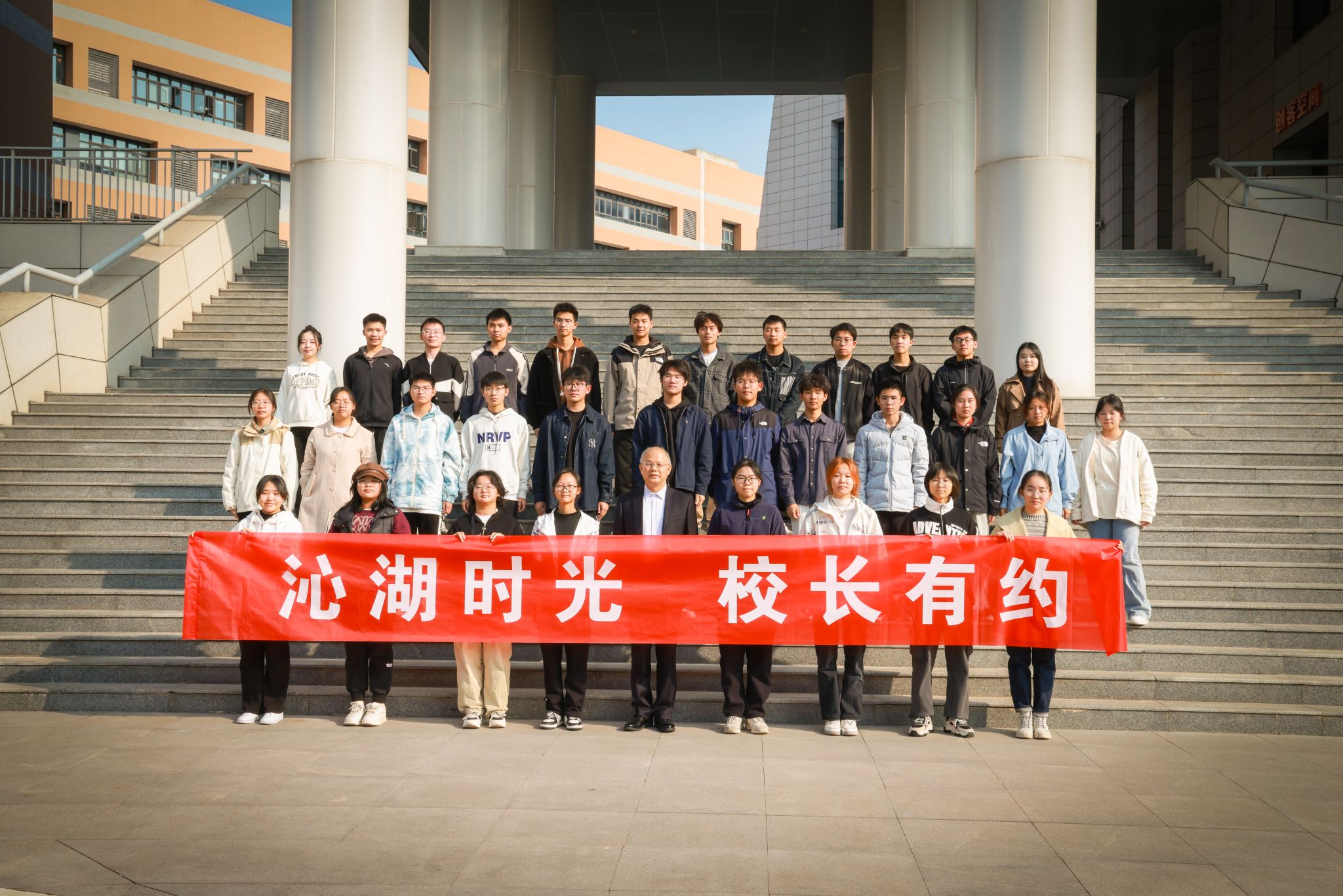 会前,倪红卫与参加活动的同学合影留念。会后,倪红卫向同学们赠送了“沁湖时光 校长有约”专属纪念笔记本。