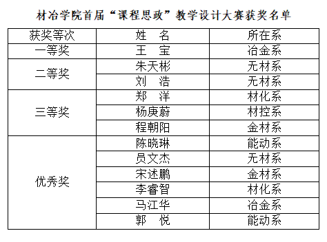 附:材料与冶金学院首届“课程思政”教学设计大赛获奖名单。