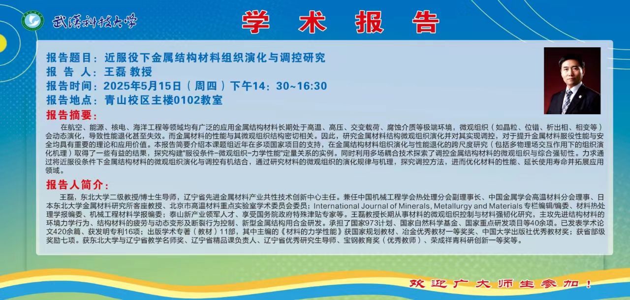 报告题目:近服役下金属结构组织演化与调控研究