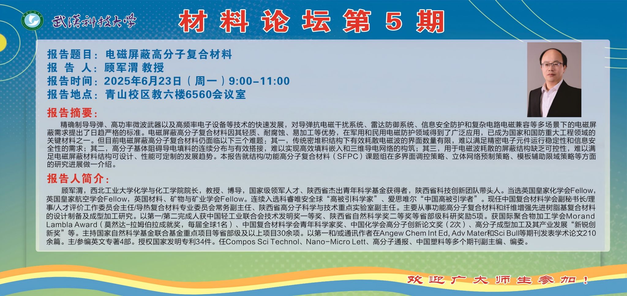 顾军渭,西北工业大学化学与化工学院院长,教授、博导,国家级领军人才、陕西省杰出青年科学基金获得者,陕西省科技创新团队带头人。当选英国皇家化学会Fellow,英国皇家航空学会Fellow,英国材料、矿物与矿业学会Fellow。连续入选科睿唯安全球“高被引科学家”、爱思唯尔“中国高被引学者”。现任中国复合材料学会副秘书长/理事/人才评价工作委员会主任/导热复合材料专业委员会常务副主任、陕西省高分子科学与技术重点实验室副主任。主要从事功能高分子复合材料和纤维增强先进树脂基复合材料的设计制备及成型加工研究。以第一/第二完成人获中国轻工业联合会技术发明奖一等奖、陕西省自然科学奖二等奖等省部级科研奖励5项。获国际聚合物加工学会Morand Lambla Award(莫然达-拉姆伯拉成就奖,每届全球1名)、中国复合材料学会青年科学家奖、中国化学会高分子创新论文奖(2次)、高分子成型加工及其产业发展“新锐创新奖”等。主持国家自然科学基金联合基金重点项目等省部级及以上项目30余项。以第一和/或通讯作者在Angew Chem Int Ed, Adv Mater和Sci Bull等期刊发表学术论文210余篇。主/参编英文专著4部。授权国家发明专利34件。任Compos Sci Technol、Nano-Micro Lett、高分子通报、中国塑料等多个期刊副主编、编委。