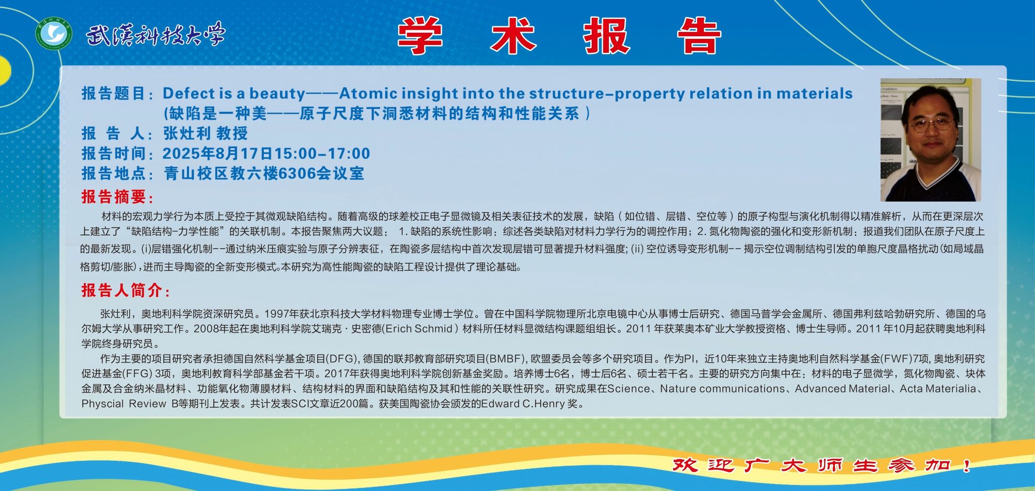 报告题目: Defect is a beauty—Atomic insight into the structure-property relation in materials.(缺陷是一种美——原子尺度下洞悉材料的结构和性能关系)
